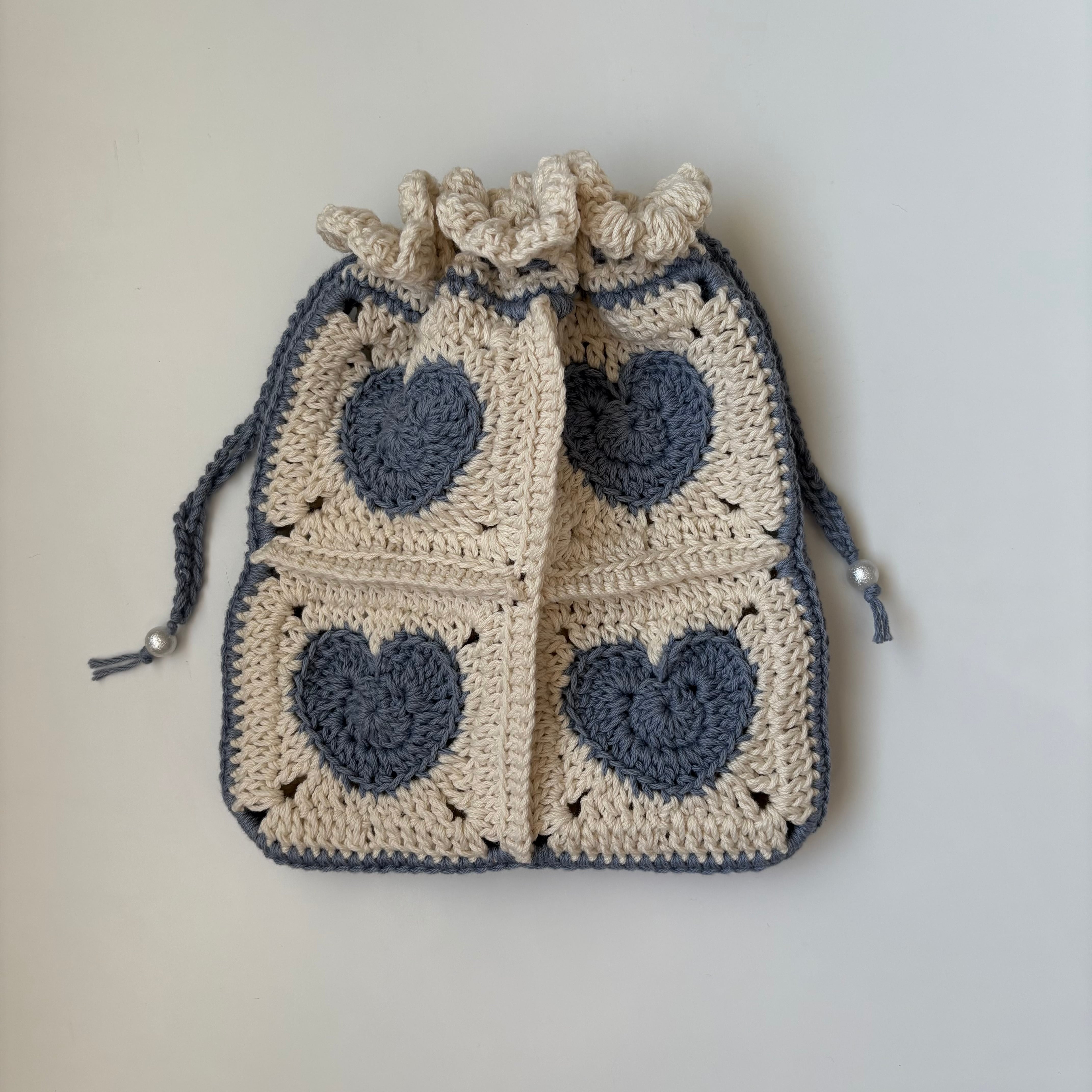 この巾着は、日常のアイテムを可愛く収納できるデザインで、愛らしいハートの形が心を和ませてくれます。
